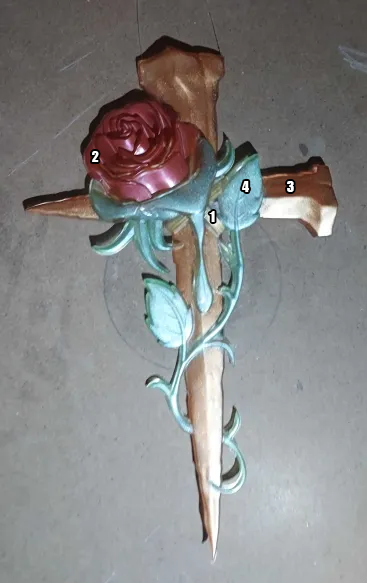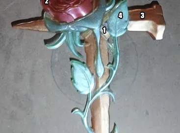 This cross & rose is made of epoxy resin, colored with micro powder colors of choice. It measures 10 inches tall by 6.1 inches wide by 0.65 inches thick. The top of the item has a small piece of 80 pound test fishing line used for hanging on a wall or hanging from a truck mirror. Beautiful when hanging in a window with sunlight behind it! (Click image to view full size.)